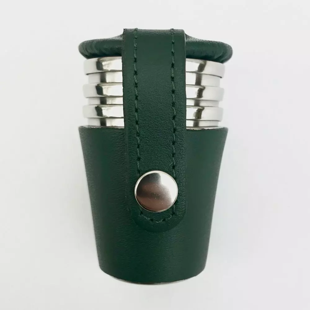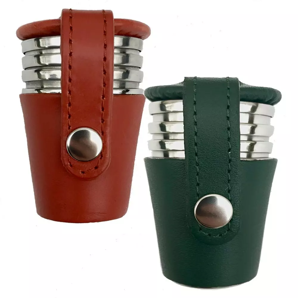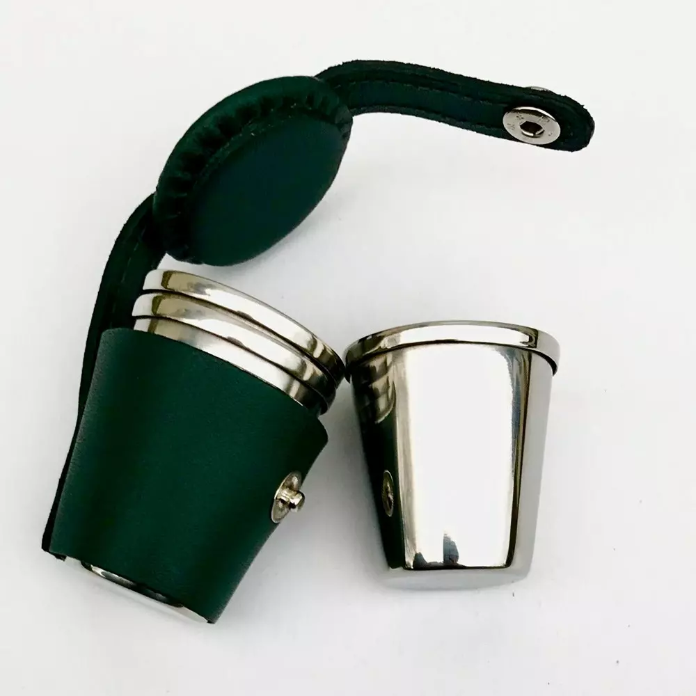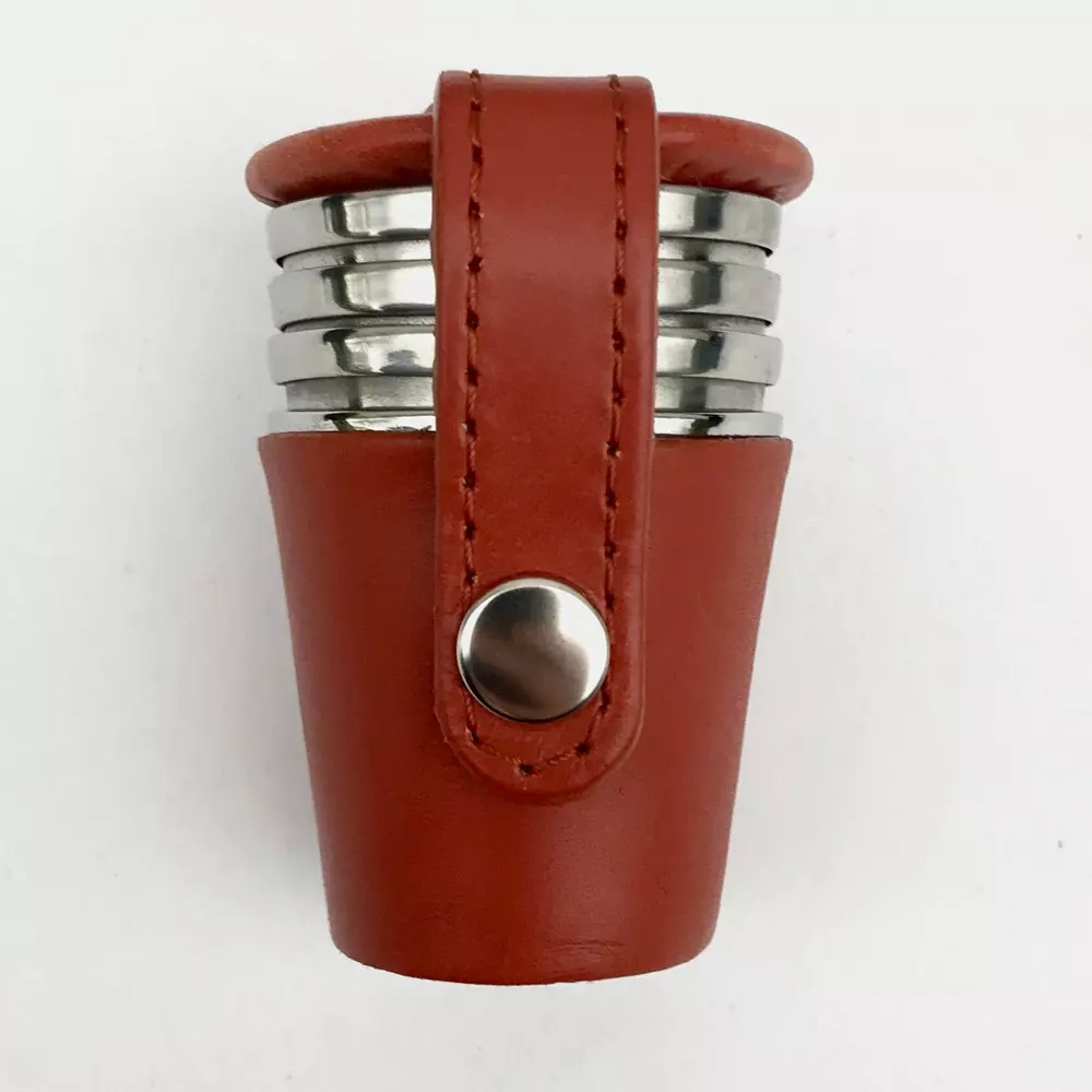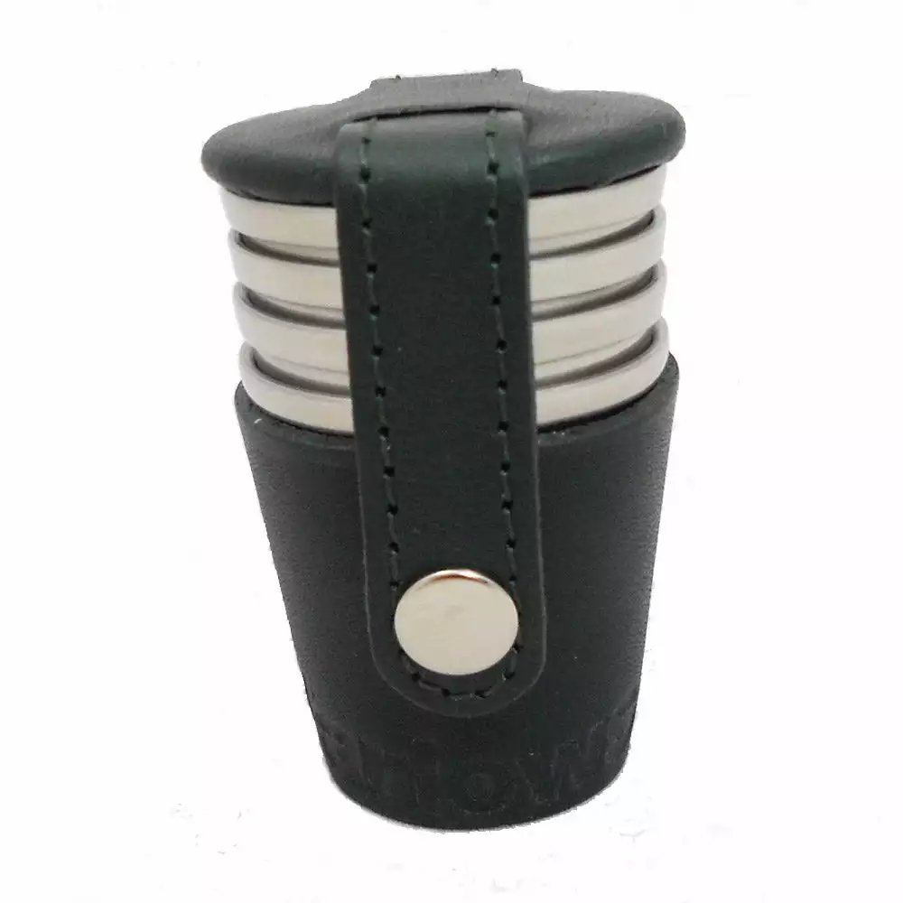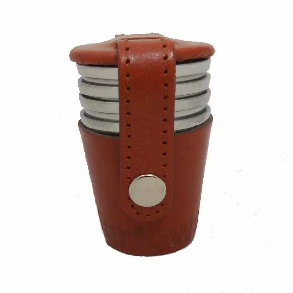 - Features 4 stainless steel cups inside a leather case with popper fastening.