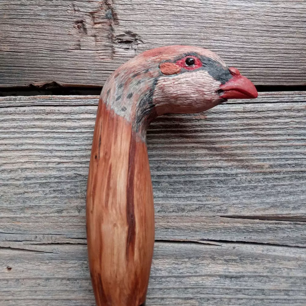 I mix and match not only the finish on a stick but also the type of wood for the best result. Although I carve the same subject matter no two sticks are the same. Each is unique and individual. To ensure the detail is correct I keep and copy from shot birds. Carving is with the grain of the wood not only to enhance the appearance but for the strength required. On average it takes twenty hours of work to complete a stick. The finished stick for me must look and feel good and most important is functional and fit for purpose.”