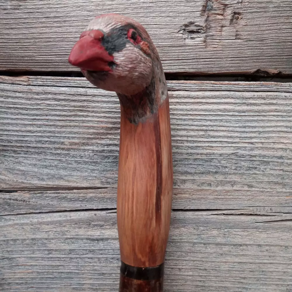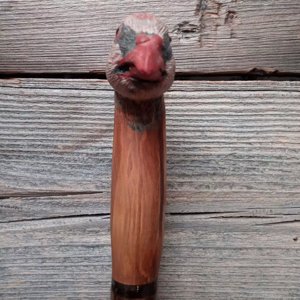 All the carved heads are from branches which have been seasoned for at least a year. Some are stained initially whilst green to enhance the grain a year later when carved. The carved head is colour stained and finished with gunstock oil. Sometimes if the grain is particularly good I leave a plain finish. The heads are joined to a shank with a threaded metal bar and secured with epoxy resin. The finish on the shank is either oil or three coats of yacht varnish.