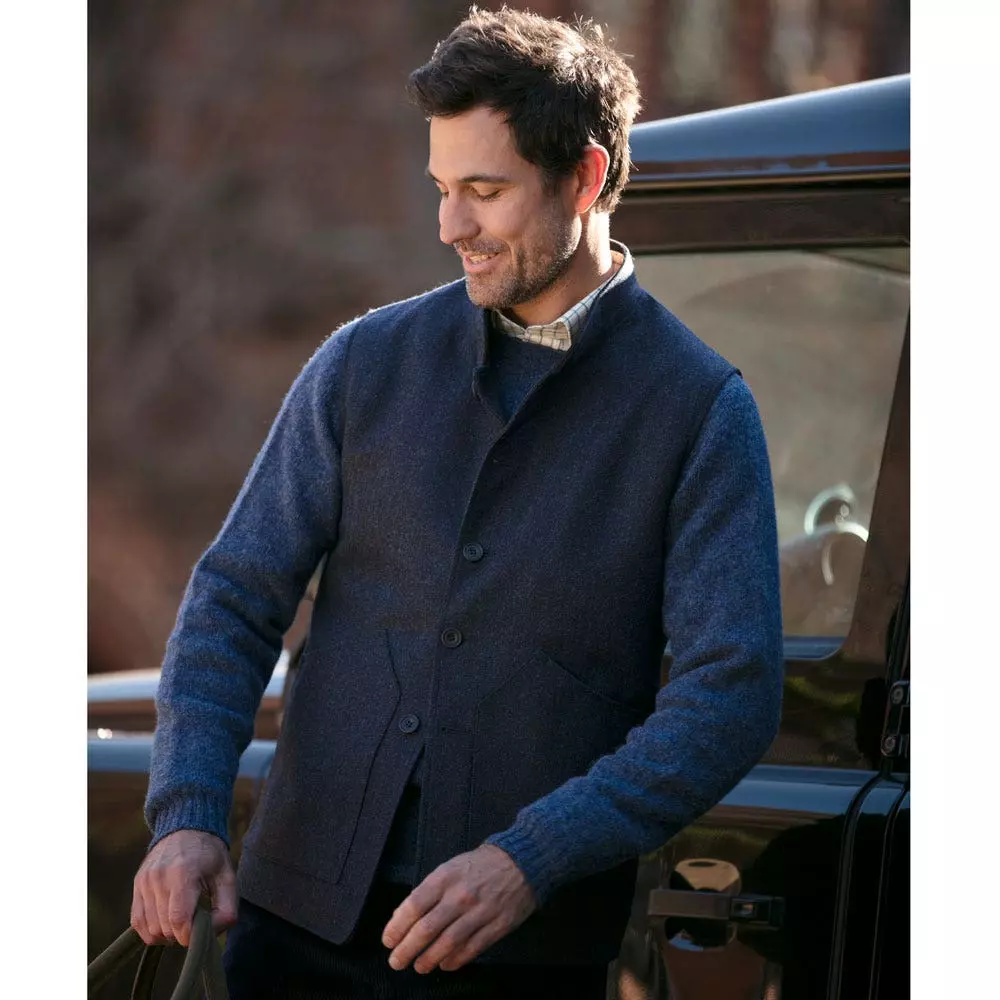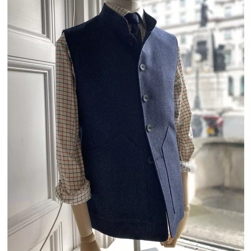 New into the collection recently, the Farlows Rudham gilet has become a firm favourite and a real staple within the Farlows collections. Designed to be worn for both town and country, smart and casual, this Nehru collar tweed vest is a must have for any wardrobe. It’s incredibly versatile and very easy to wear with a variety of different outfits. For AW22 we have introduced Navy hopsack colour, which further helps the versatility of this wonderful item of country clothing. Also referred to as a waistcoat or vest, this is an essential part of your shooting clothing and country attire wardrobe.