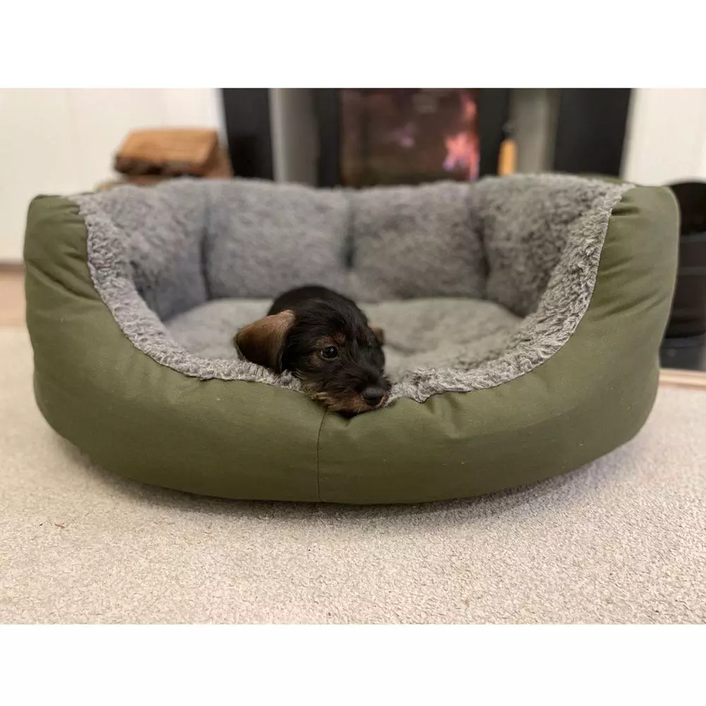 Made exclusively for Farlows in the UK from a heavy duty olive green poly cotton fabric combined with a fully recycled polyester high loft fleece in tonal grey, our slumber beds make a luxurious and seriously comfortable bed for your four–legged friends.