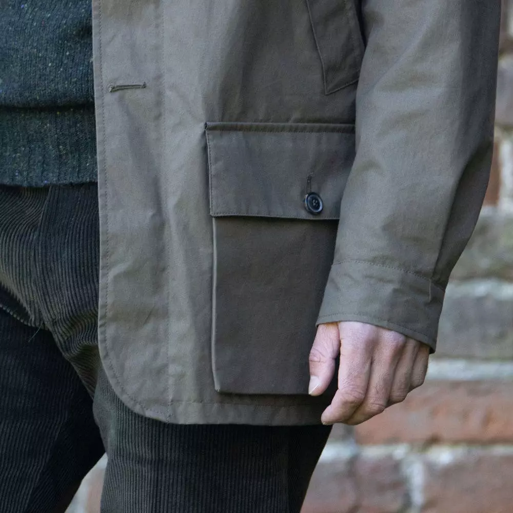 This men’s shooting coat is produced in our Super Dry Wax cotton fabric, for maximum protection against the elements. Our olive Super Dry Wax cotton does what it says on the tin. It’s a fully waxed cotton, however its dry to the touch. The cotton fibres are impregnated with wax, so it won’t ever need to be re-applied like in old times.