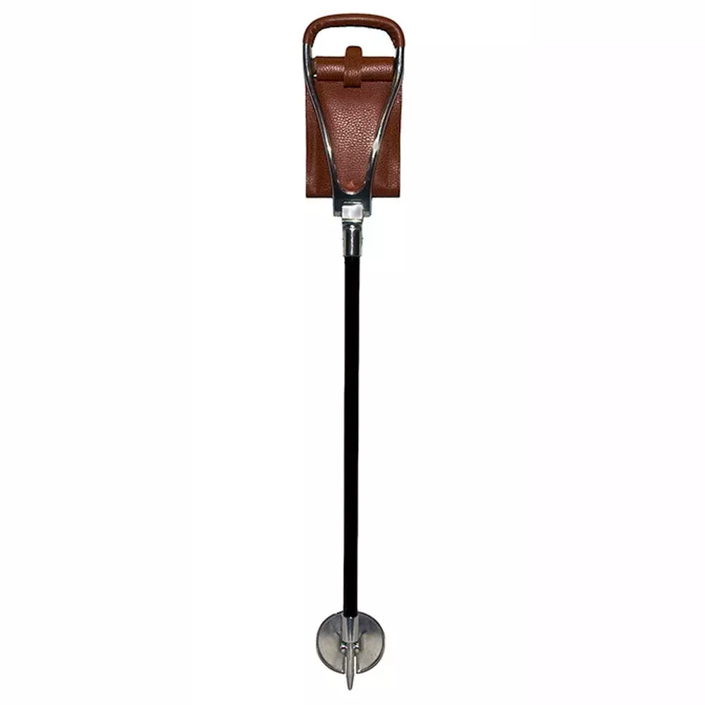 A traditional leather shooting seat that is non adjustable. The shooting stick has a padded leather seat and leather handles.