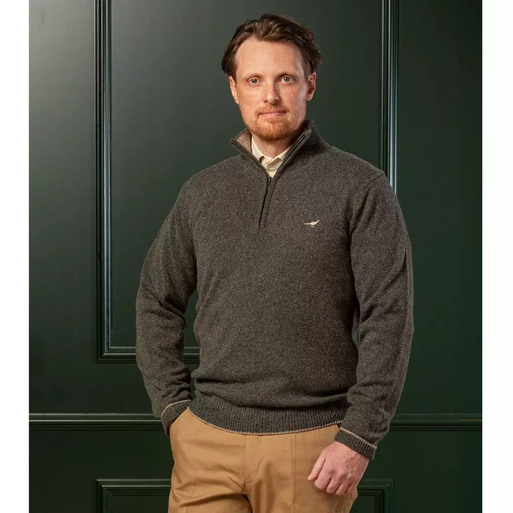 A quarter zip neck sweater in soft 100% Italian superfine lambswool, with contrasting colour inside neck opening.