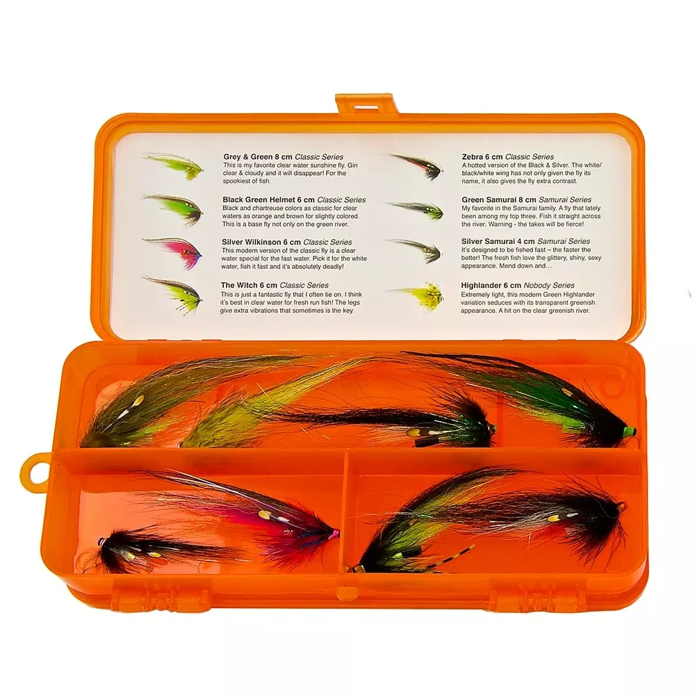 Mikael Frodin’s fly selections are based on thousands of fishing days and tens of thousands of takes. In every box you find a valuable note made of tear and waterproof paper, with tips from Mikael Frödin. When to fish the flies, where and maybe even how to make them produce the take.