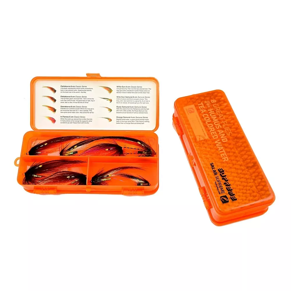A favourite for the darker water! Flies that have taken many thousand fish, presented in our medium double SALAR Supreme box.