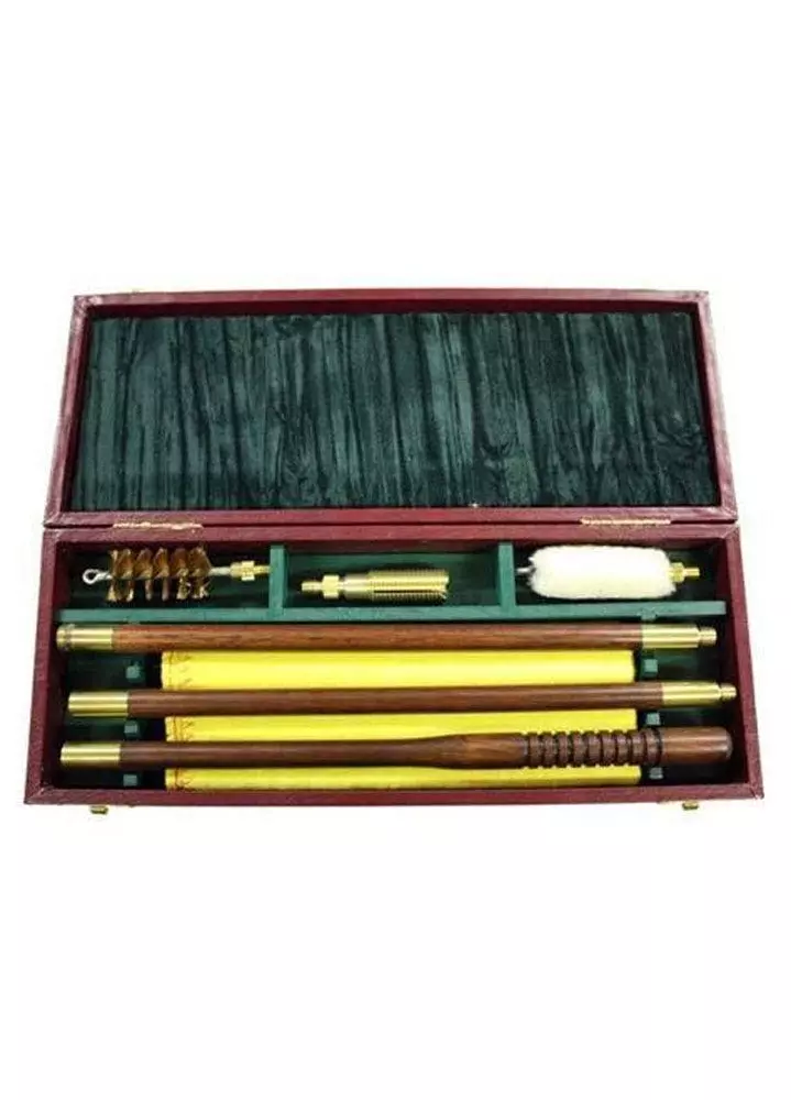 A deluxe 3 piece gun cleaning kit in a burgundy leatheret box