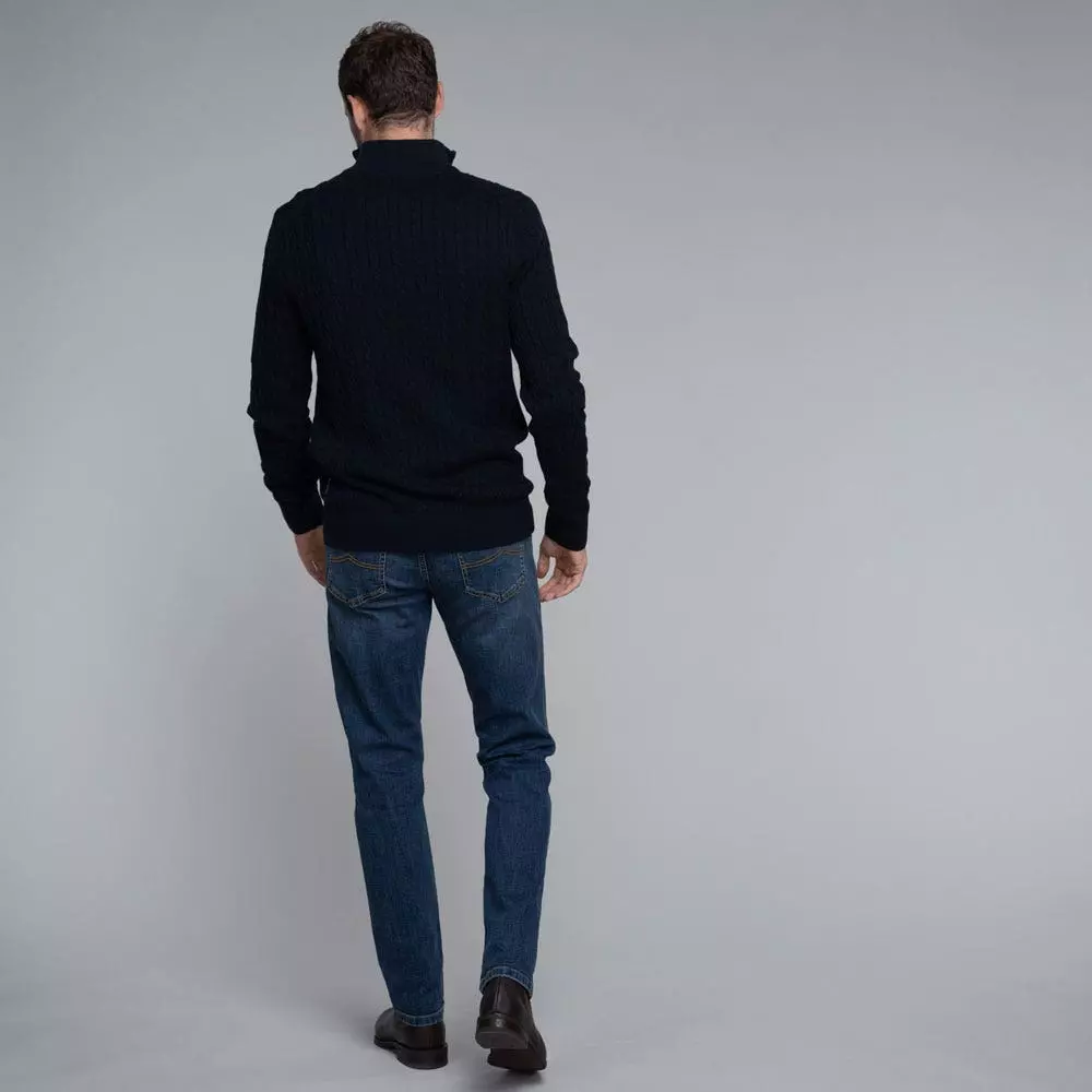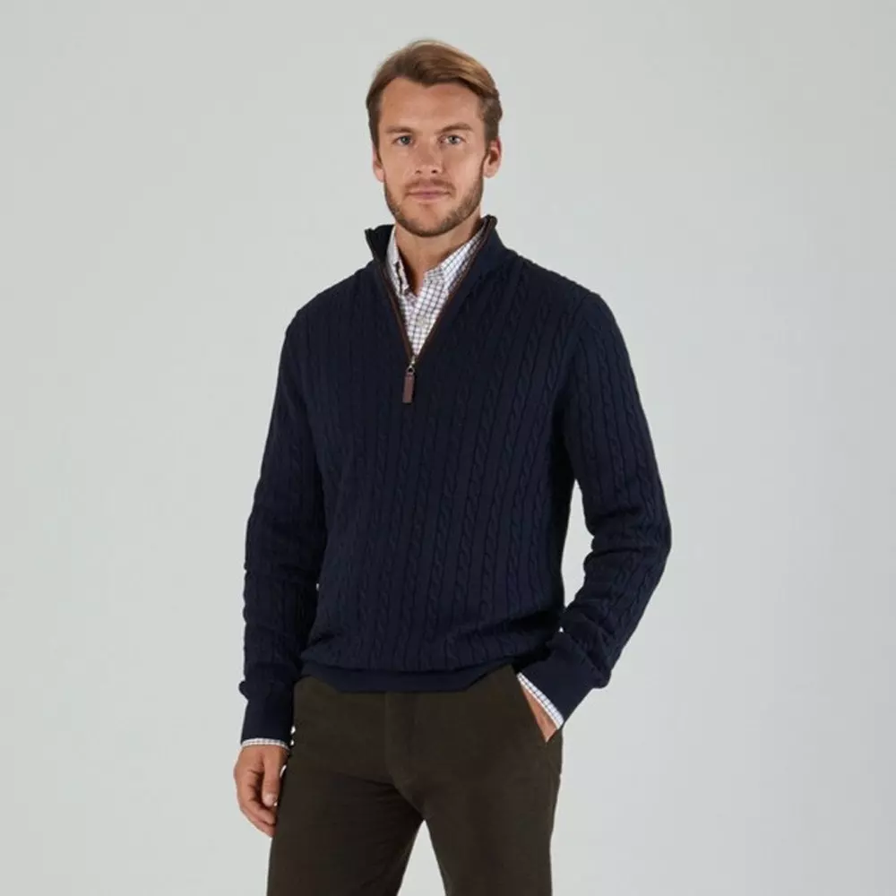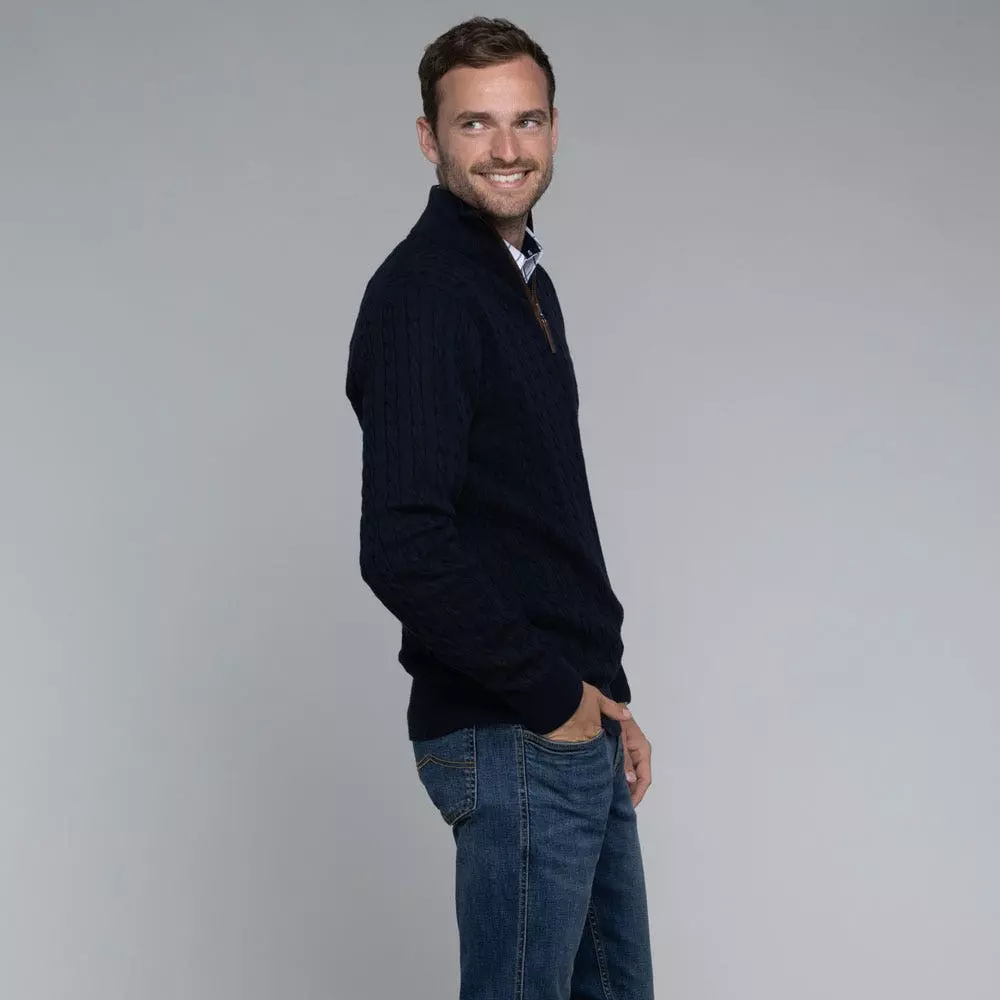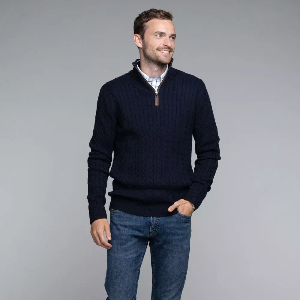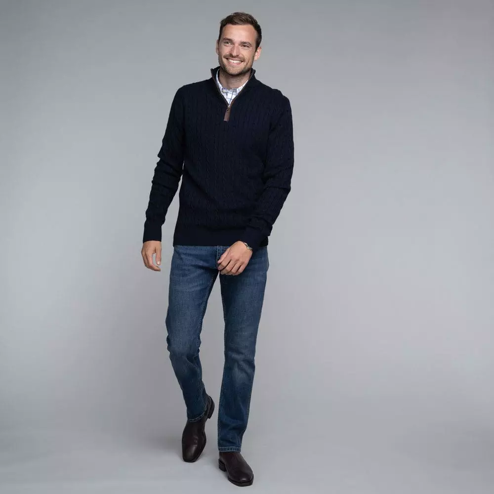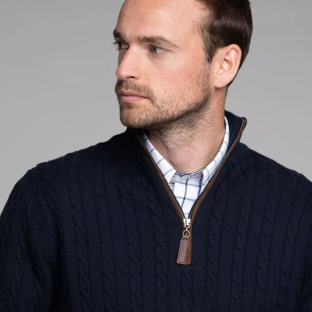 The Schoffel Cashmere Cable 1/4 Zip Jumper is great for casual days. It features a blend of cashmere and cotton for warmth, comfort and durability. Finished with Alcantara trim detail and leather branded zip pull, this cable knit jumper is luxuriously soft.